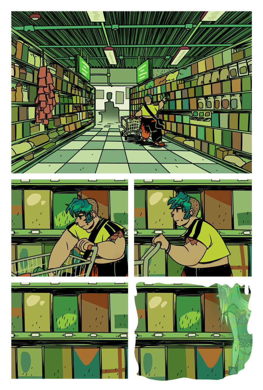 4-24.1 Mid shot from in front of Jane as she stands in the middle of an aisle at the supermarket and picks a box of cereal off the shelf. The store looks like a cross between Publix and Winn-Dixie. Jane's pushing a small cart mostly filled with microwave meals and junk food. The front of the store and the natural light flooding in through the windows is visible behind her. Her cart is facing the front of the store.