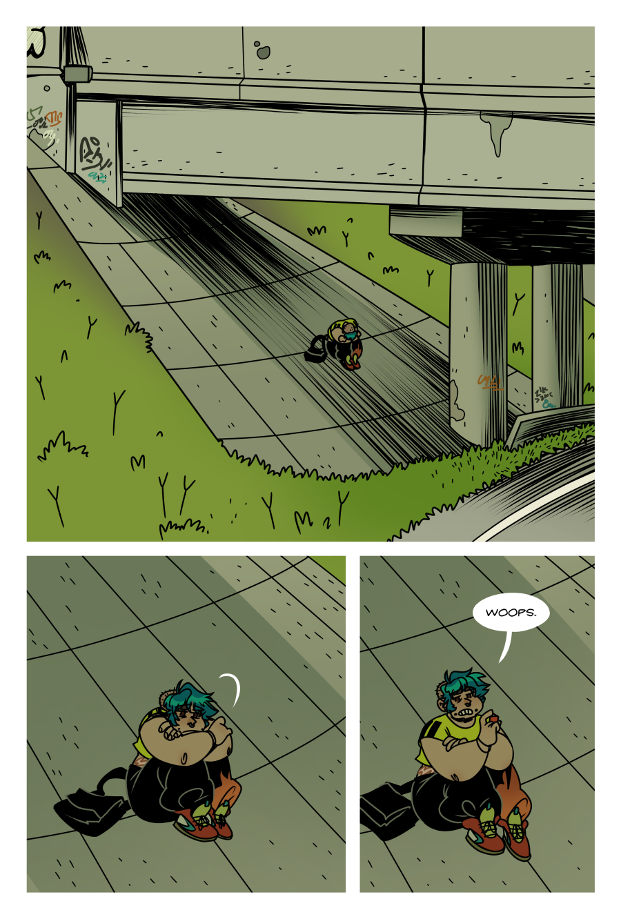 4-32.1 Wide, long shot of Jane having taken refuge next to an underpass by a highway. Not too far from her there's a half-filled retention pond. She's surrounded by bahia grass and the sky is partly cloudy. Jane herself is sitting with her knees drawn up to her chest and her head tucked into them.