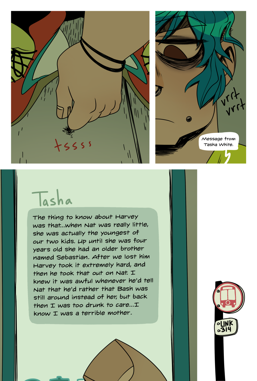4-34.3 The whole panel is just Jane's not-Facebook messenger. TASHA: The thing to know about Harvey was that...when Nat was really little, she was actually the youngest of our two kids. Up until she was four years old she had an older brother named Sebastian. After we lost him Harvey took it extremely hard, and then he took that out on Nat. I knew it was awful whenever he'd tell Nat that he'd rather that Bash was still around instead of her, but back then I was too drunk to care...I know I was a terrible mother.