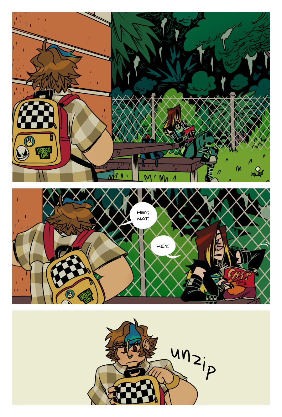 4-35.2 Closer in shot of Jane sitting down and starting to take off her backpack while Nat briefly glances up from her chip bag. She has bags under her eyes. JANE: Hey, Nat. NAT: Hey.