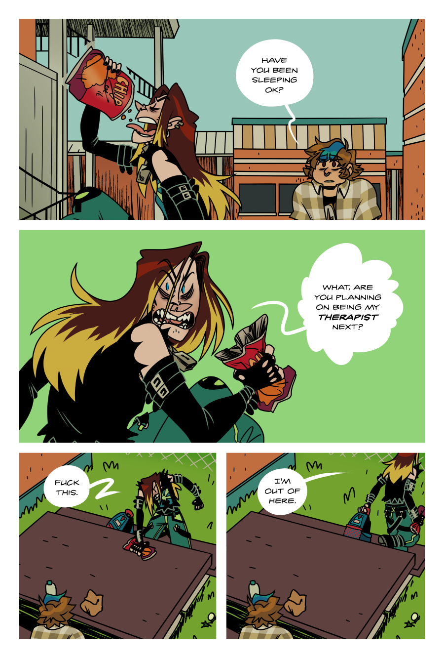 4-41.2 Shot from in front of Nat of her shooting a furious glance at Jane. She is still hoisting the bag and she looks absolutely livid. The background drops out to a hyper-saturated teal. NAT: What, are you planning on being my therapist next?