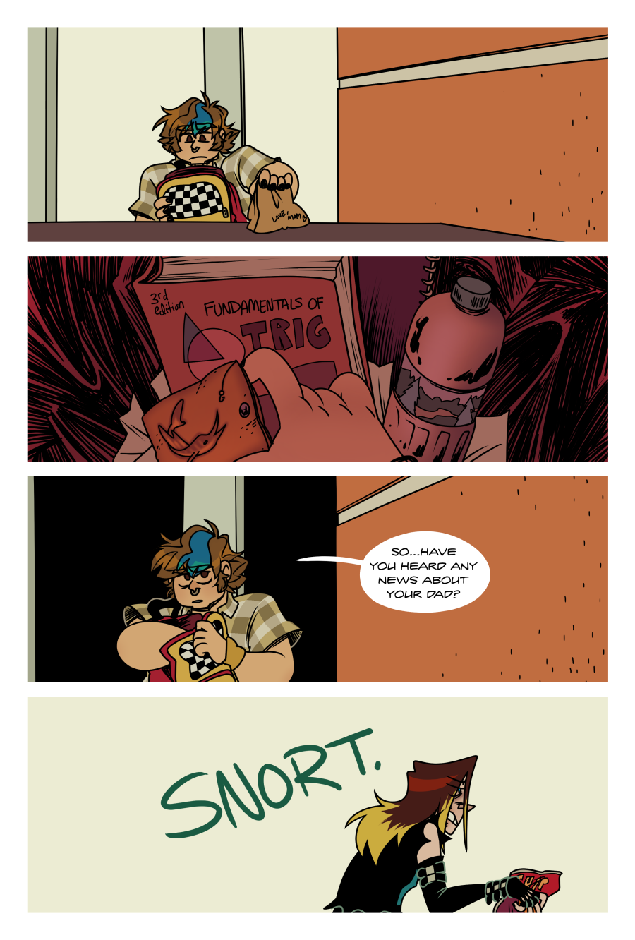 4-35.2 Closer in shot of Jane sitting down and starting to take off her backpack while Nat briefly glances up from her chip bag. She has bags under her eyes. JANE: Hey, Nat. NAT: Hey.